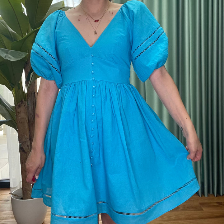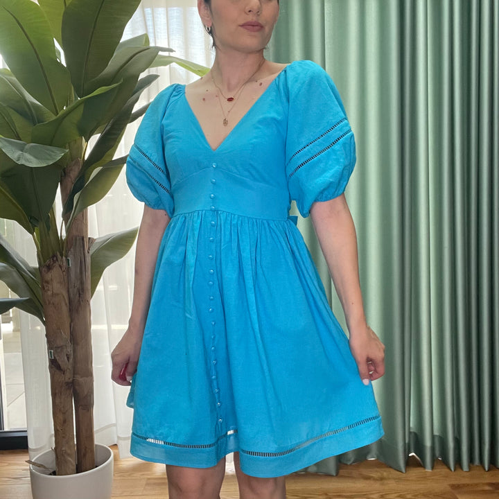 Abito con manica leggermente a palloncino, bottoni finti sul davanti.Chiusa con zip sul retro.