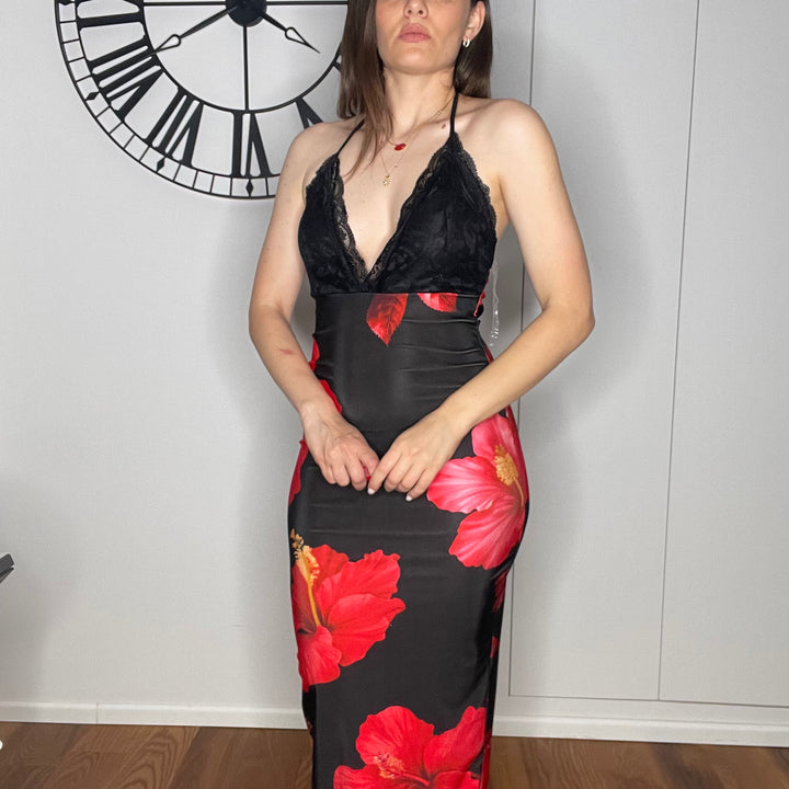 Abito con stampa sfumata.spacco sul fondo.Parte superiore in pizzo con coppetta imbottita.Si lega dietro al collo.Veste fino a una taglia 46.