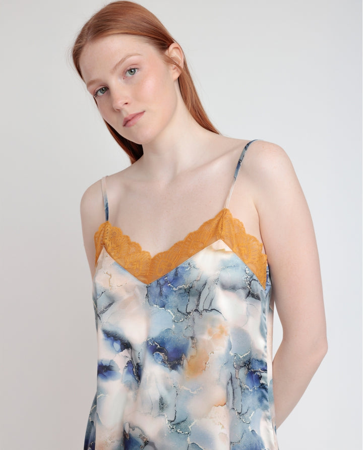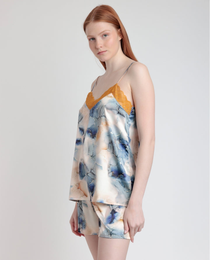 * Pigiama in tessuto satinato, cinghie, scollo a V e pantaloncini.
