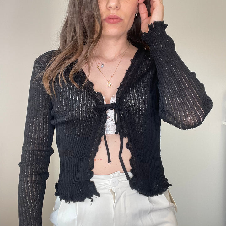 Cardigan in filo con chiusura con laccio. Veste fino a una taglia 46.