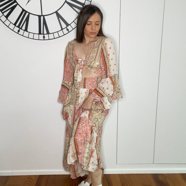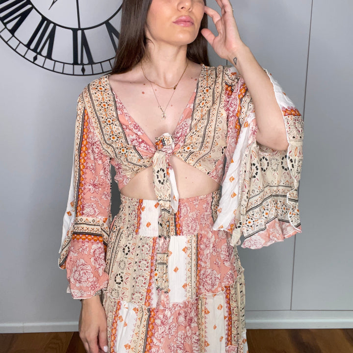 Coordinato stampa etnica, composto da incrociati che può essere legata sia sul davanti che dietro,manica lunga svasata e gonnellino con elastico.Veste fino a una taglia 46.