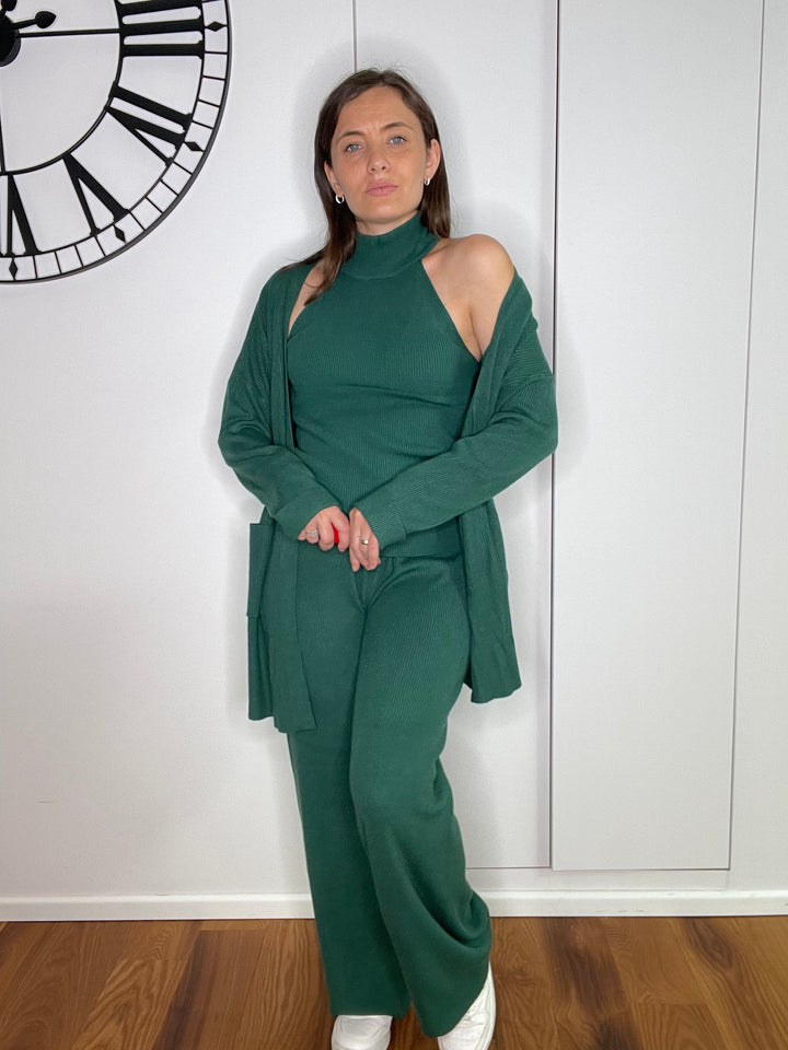 Coordinato composto da 3 pezzi:Top mezzo collo, cardigan con tasche e pantalone a palazzo con vita alta ed elastico in vita morbido.