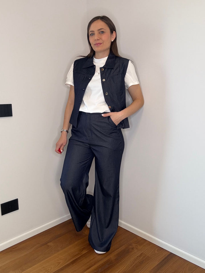 Un look casual-chic perfetto per la mezza stagione:questo coordinato effetto denim unisce comfort e stile in un insieme armonioso.Il pantalone palazzo, ampio e fluido dona movimento alla figura e garantisce una vestibilità comoda grazie all'elastico posteriore in vitacee si adatta alle forme senza costrizione.Il giacchino dal taglio dritto impreziosito da una chiusure frontale con bottoni ispirati al classico denim.Un completo versatile da indossare con sneakers per un look urbano o con sandali per un tocco più femminile.Vestibilità regolare