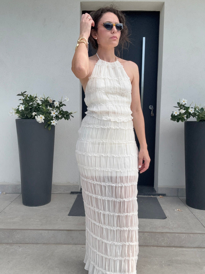 Il coordinato è composto da top con chiusura con laccetti al collo, scollo sul retro con bretelle regolabili.