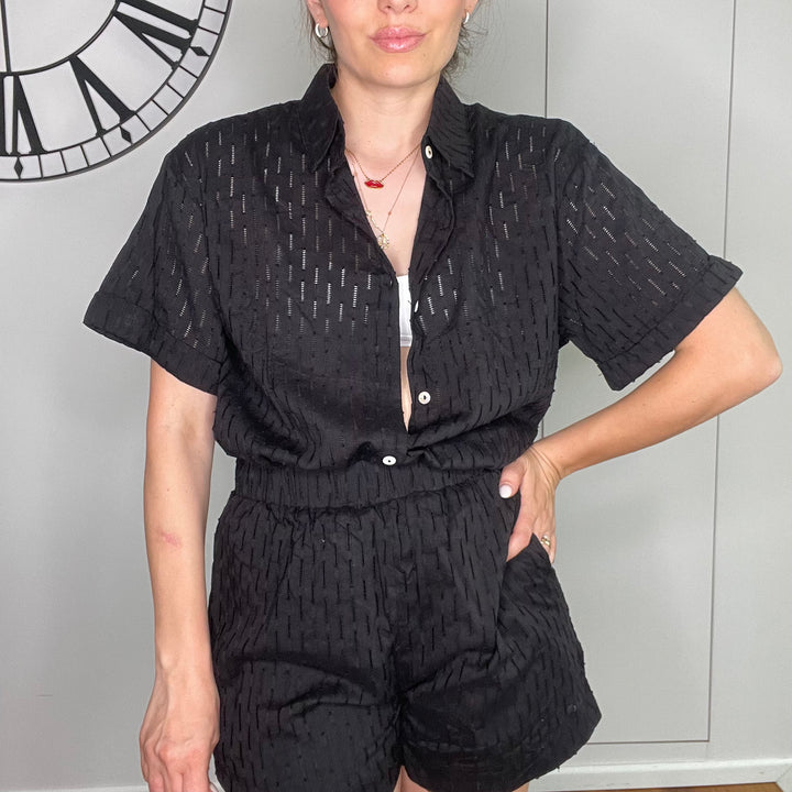 Coordinato composto da camicia mezza manica traforata,vestibilità over e pantaloncino con elastico.