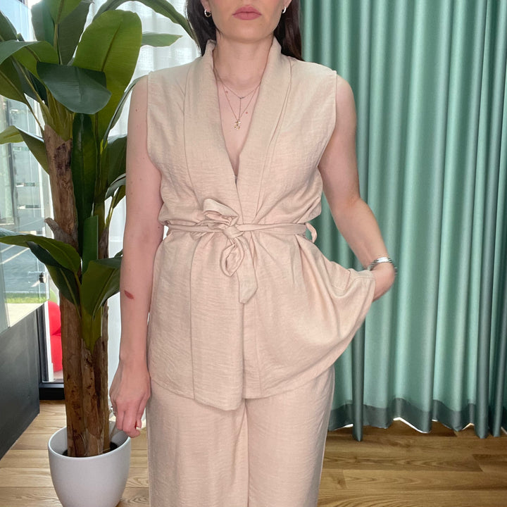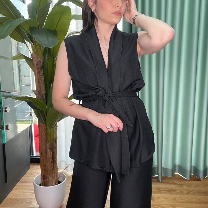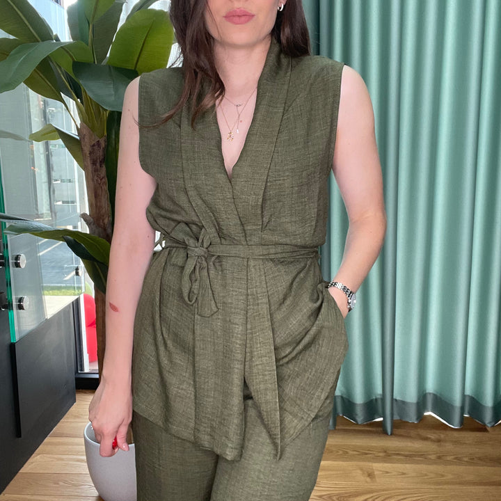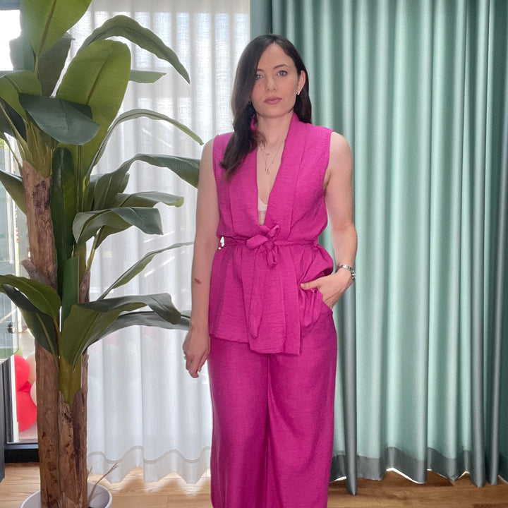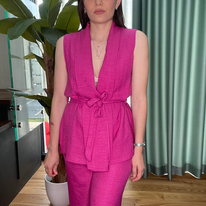 Coordinato con smanicato che si chiude con fusciacca.Pantalone con elastico e gamba larga.Veste fino a una taglia 46.