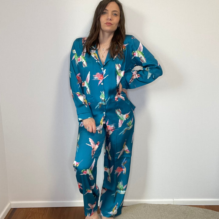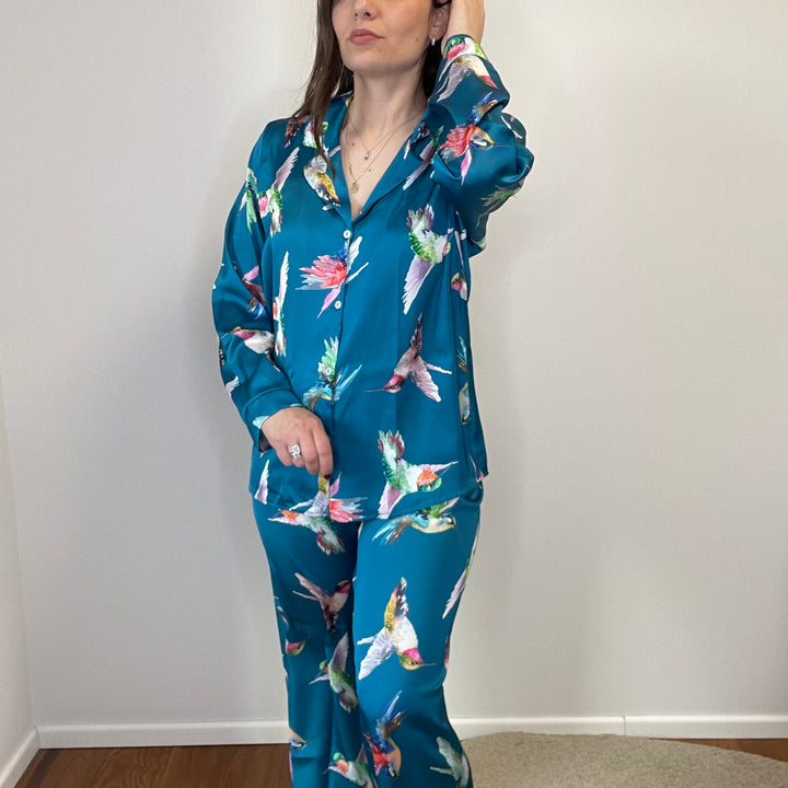 Pigiama in raso:camicia con colletto chiusura anteriore con bottoni, pantalone con elastico in vita.