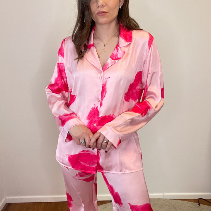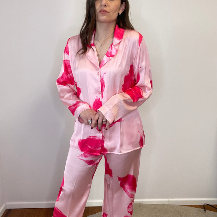 Pigiama in raso:camicia con colletto chiusura anteriore con bottoni, pantalone con elastico in vita.