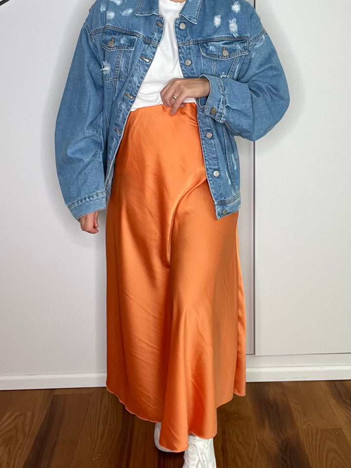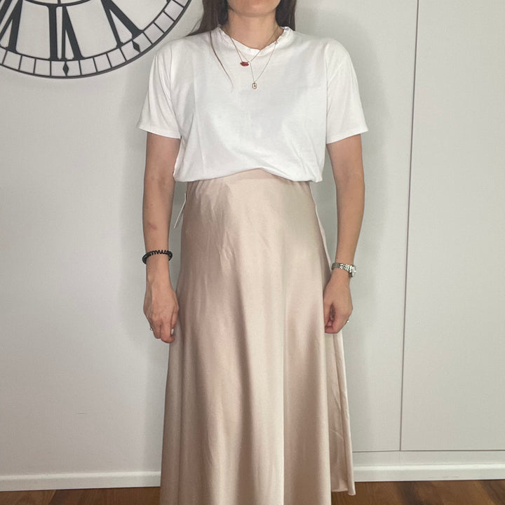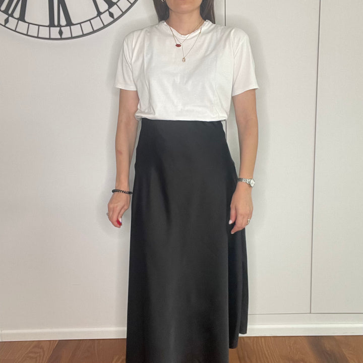 Gonna in raso con elastico coperto in vita.Veste fino a una taglia 46.
