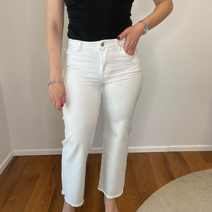 Jeans a gamba larga sfrangiato leggermente sul fondo.Tessuto elasticizzato.