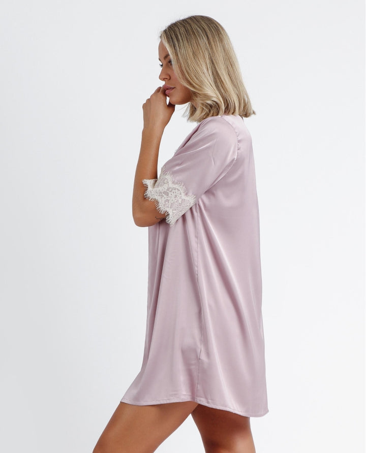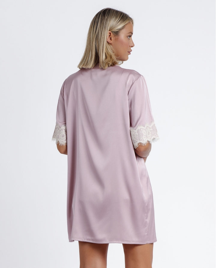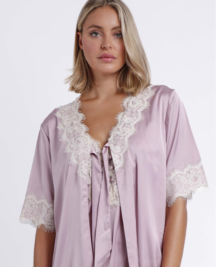 Impreziosita da un delicato pizzo sfrangiato lungo la scollatura, questa vestaglia presenta maniche corte a campana, anch'esse rifinite in pizzo, che aggiungono un tocco di femminilità e stile.