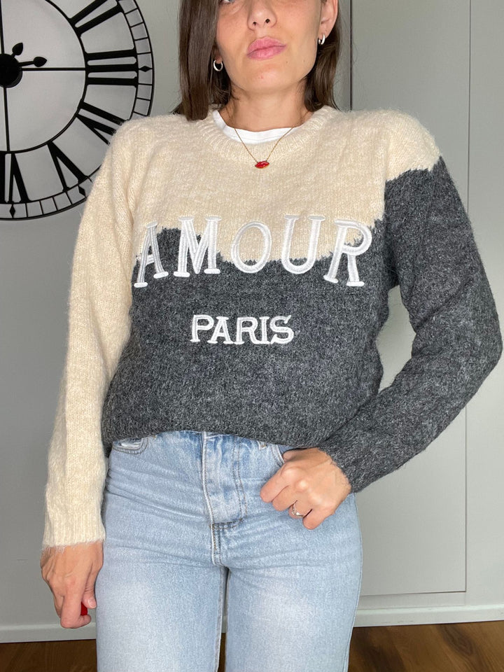 Maglione con scritta sul davanti modello girocollo,veste fino a una taglia 46.