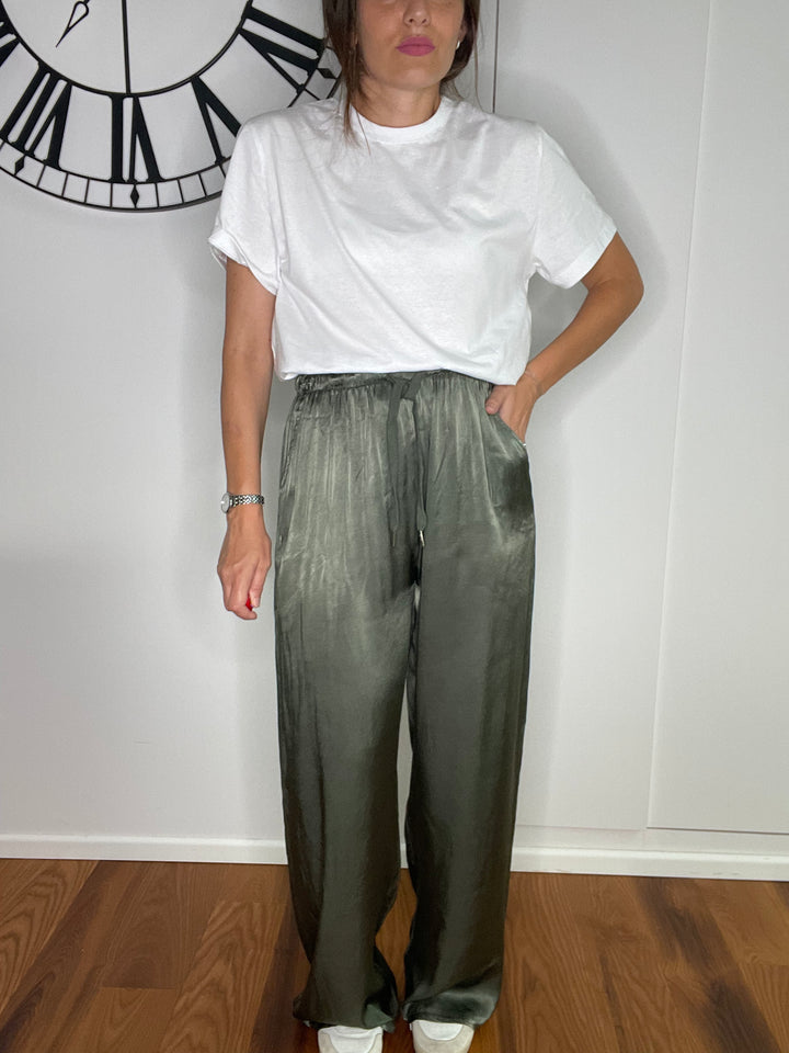 Pantalone con elastico in vita, gamba morbida e ampia, leggermente elasticizzato, veste da taglia xs ad una L abbondante.