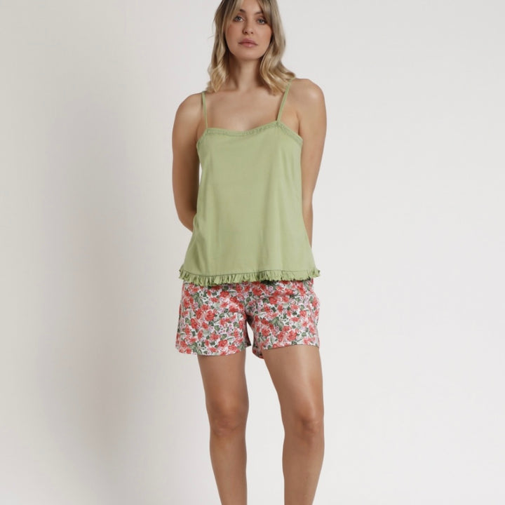 Pigiama donna composta da canotta con spallina stretta regolabile con Rouches sul bordo.Pantalocino con stampa a fiori.Vestibilità regolare.