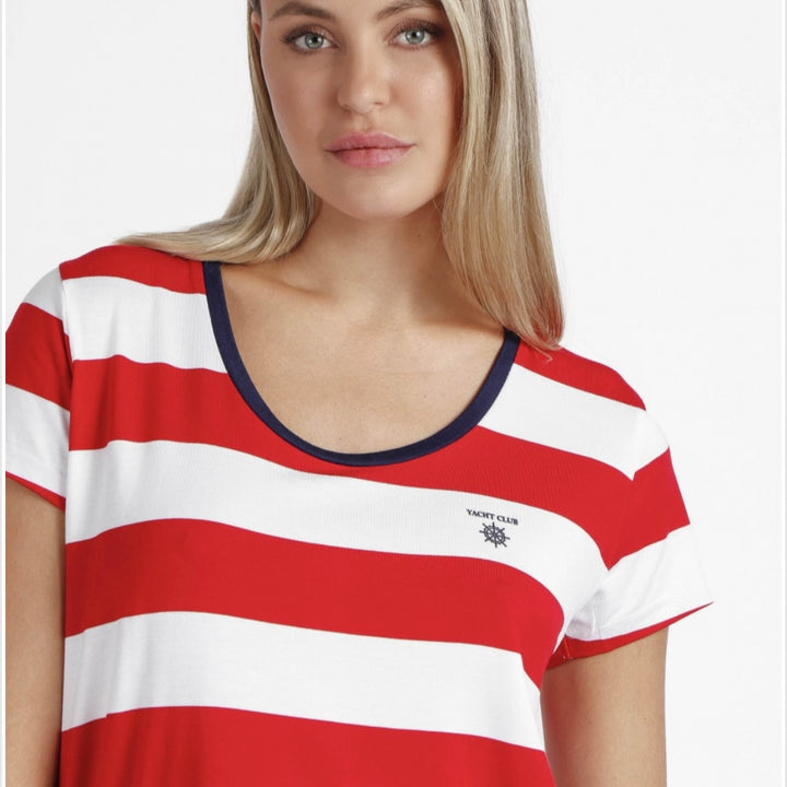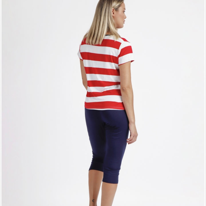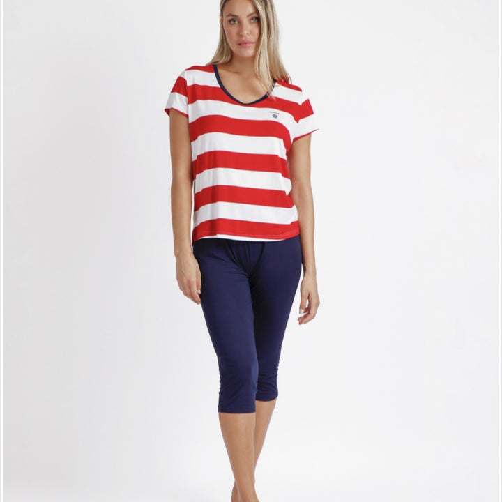 Pigiama a maniche corte a righe bianche e rosse.Pantalone modello capri in blu scuro.