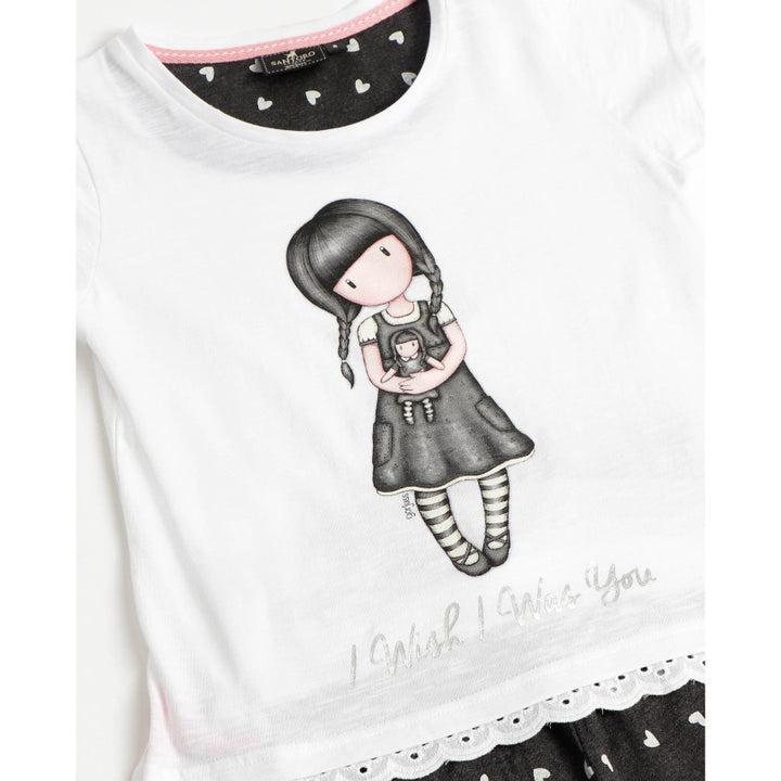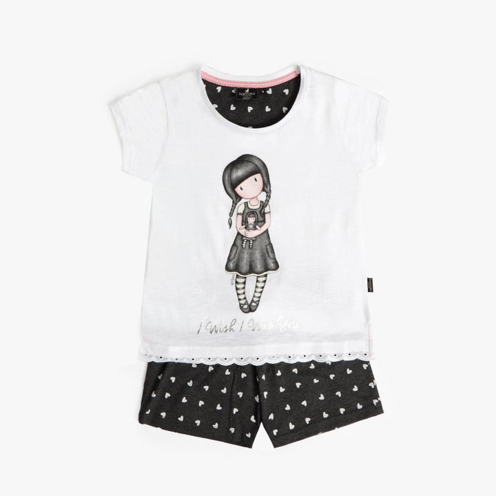 T-shirt ideale da indossare nelle caldissime serate e notti estive. Maglia bianca, stampa dell'iconico personaggio col suo abitino nero glitterato. Scritta grigia metallizzata. Bordino in pizzo sangallo. Spacchettini laterali con rifinitura fettuccia rosa. Pantaloncino con elastico in vita, laccettini rosa per la regolazione della circonferenza. A fondo antracite con cuoricini bianchi.