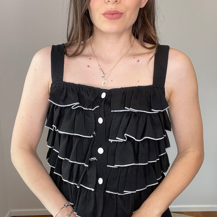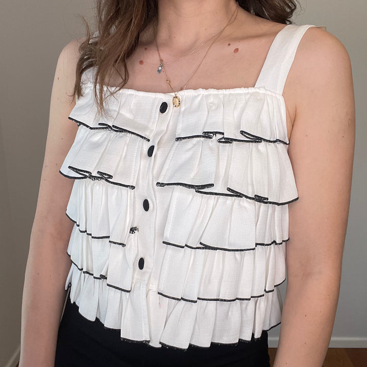 Top modello cardigan bianco con balze e profili nero.I bottoni sono in tessuto nero.