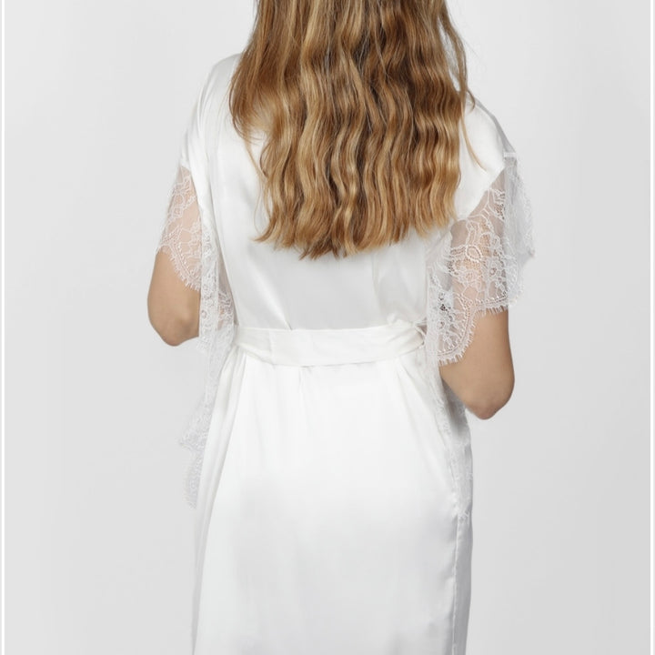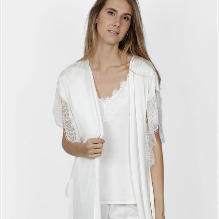 Vestaglia in tessuto satinato,mnaiche corte con dettgli in pizzo.